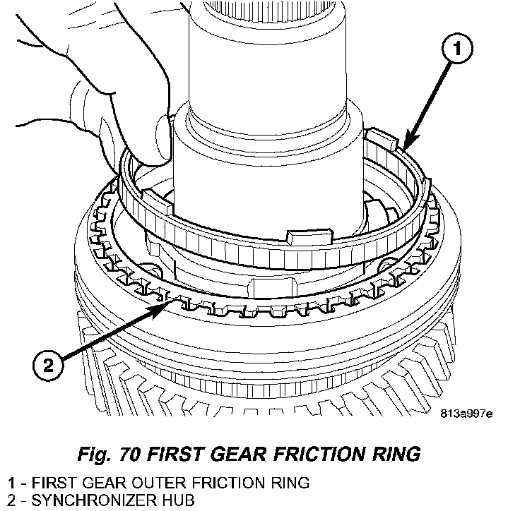 12. Install first gear outer friction ring (1) (Fig. 70) into synchronizer hub (2).