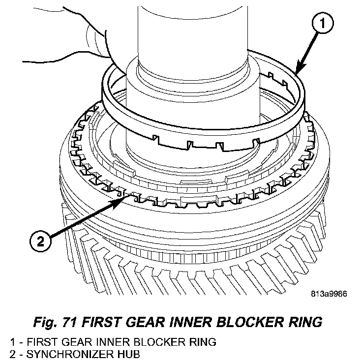 13. Install first gear inner blocker ring (1) (Fig. 71) into synchronizer hub (2).