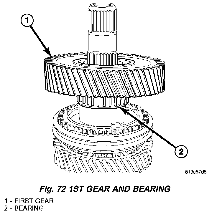 14. Install first gear (1) (Fig. 72) and bearing (2). Then center 1-2 synchronizer sleeve on synchronizer hub.