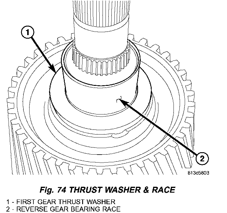 16. Using welding gloves, install first gear thrust washer (1) (Fig. 74) and reverse gear bearing race (2).