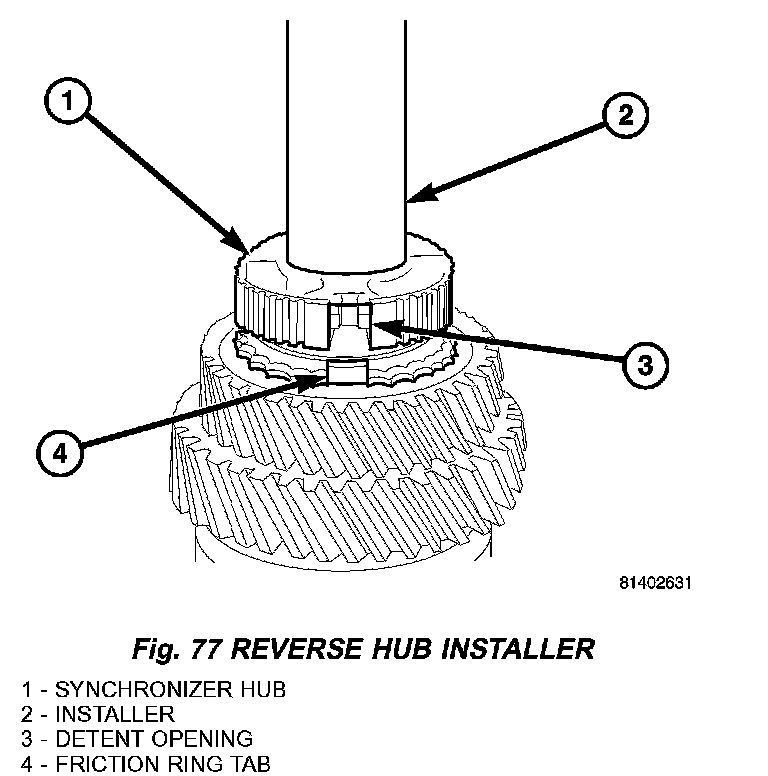 19. Install reverse gear synchronizer hub (1) on mainshaft with Installer W-262 (2) and a press. Align hub detent opening (3) with friction ring (4) lug (Fig. 77).