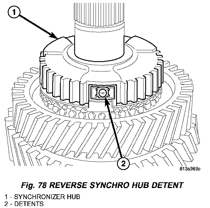 20. Install reverse gear synchronizer hub (1) (Fig. 78) detents (2).