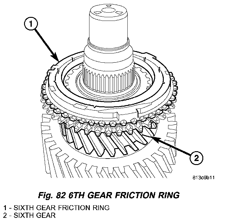 25. Install sixth gear synchronizer friction ring (1) (Fig. 82) on sixth gear (2).
