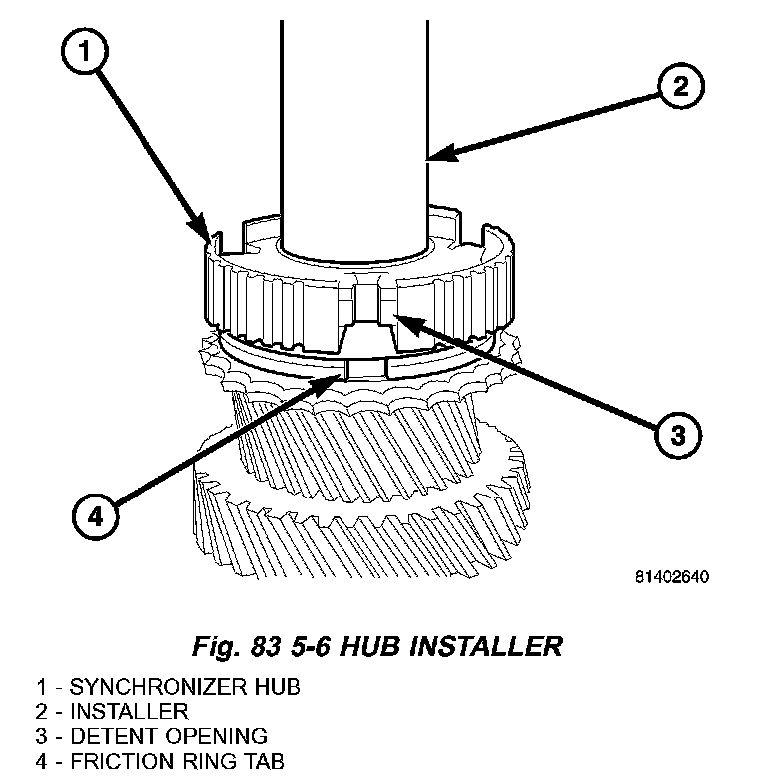 26. Install 5-6 synchronizer hub (1) with Installer W-262 (2). Align hub detent opening (3) with friction ring lugs (4) and press hub on mainshaft (Fig. 83).