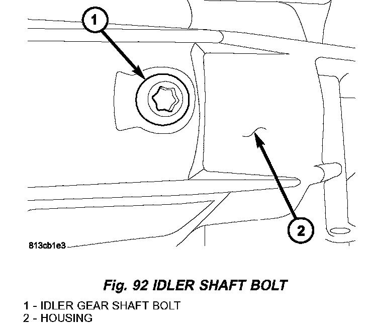 9. Install idler gear shaft bolt (1) (Fig. 92) into the housing (2) and tighten to 20 Nm (15 ft. lbs.).