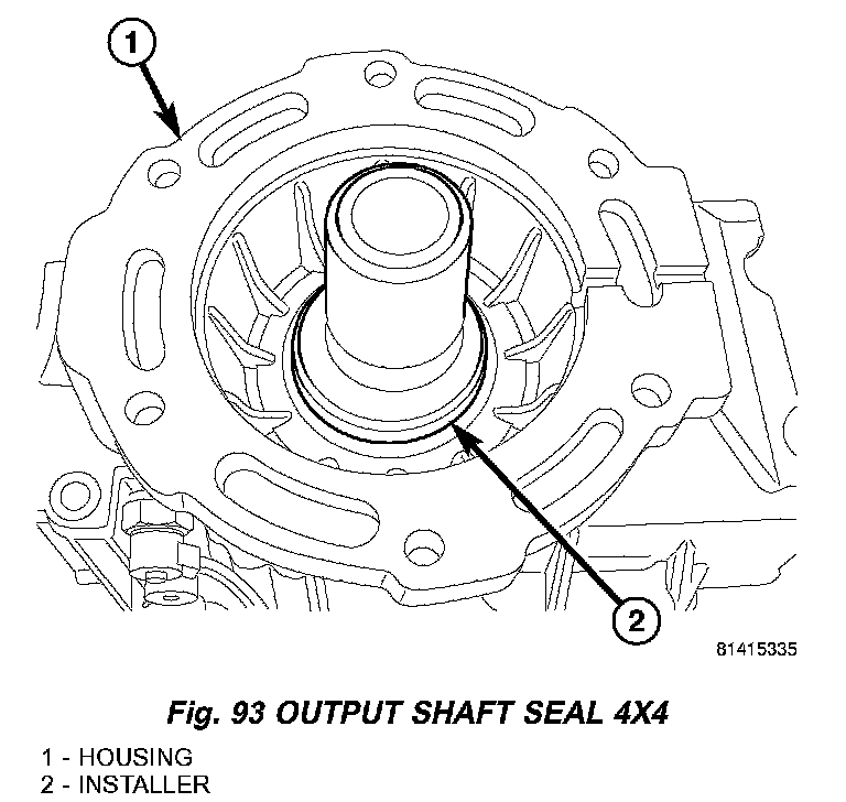 10. Install 4x4 output shaft seal into rear housing (1) with Installer 9638 (2) (Fig. 93). Install 4x2 output shaft seal into rear housing with Installer 9635 and Tube 6448A.
