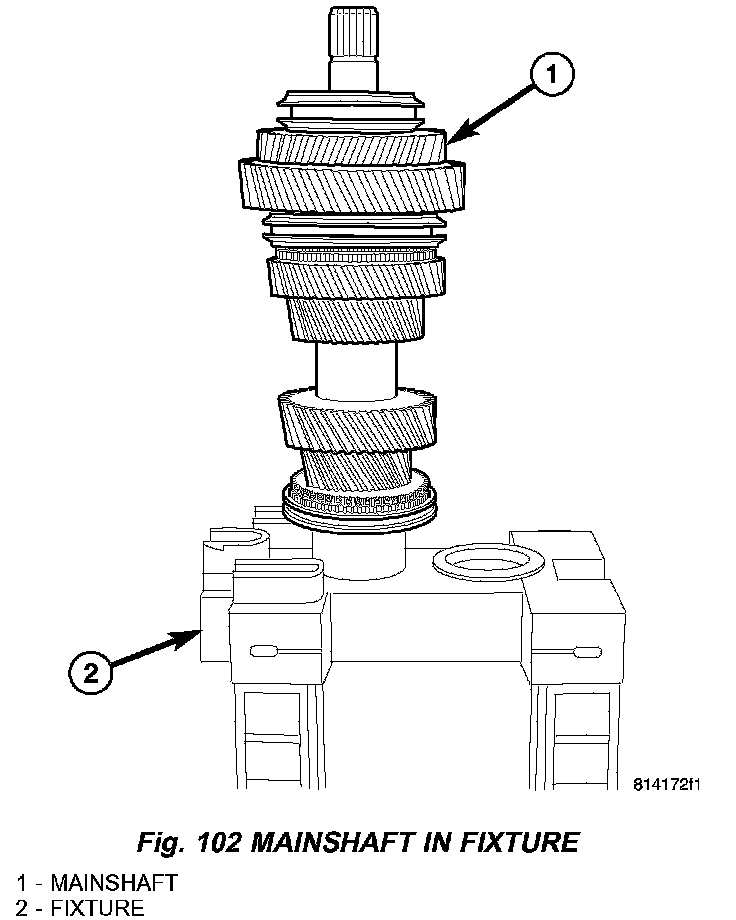 1. Install mainshaft (1) onto Build Fixture 9633 (2) (Fig. 102).