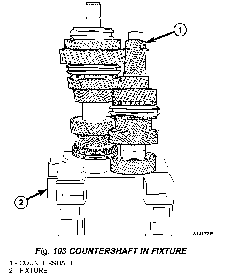 2. Install countershaft (1) onto Build Fixture 9633 (2) (Fig. 103).