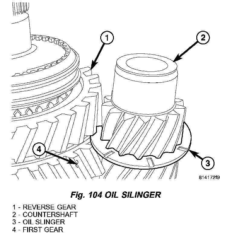 3. Install oil slinger (3) on countershaft (2) between reverse (1) and first gear (4) (Fig. 104).