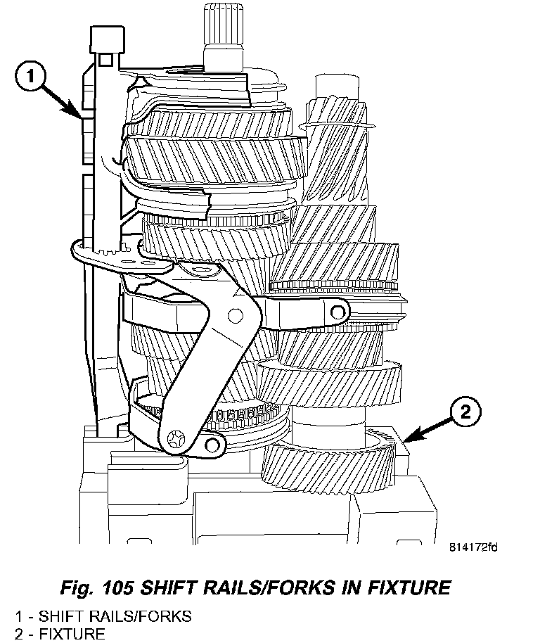 4. Install shift rails and forks (1) onto Build Fixture 9633 (2) and countershaft/mainshaft. (Fig. 105).