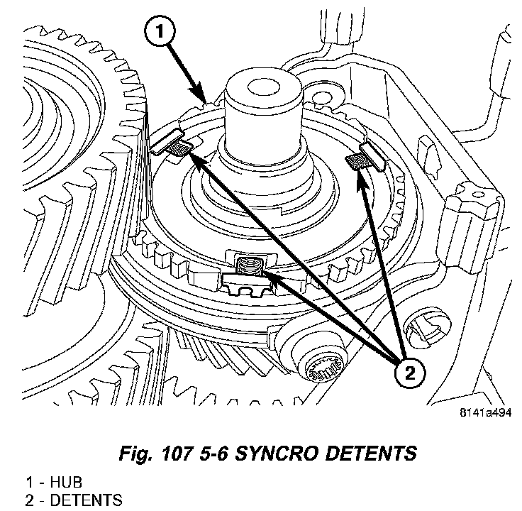 7. Install 5-6 synchronizer hub (1) (Fig. 107) detents, springs, and balls (2).