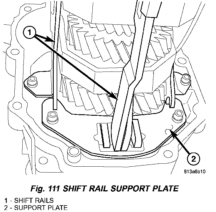 11. Install shift rail (1) (Fig. 111) support plate (2) bolts and tighten to 8 Nm (71 inch lbs.).