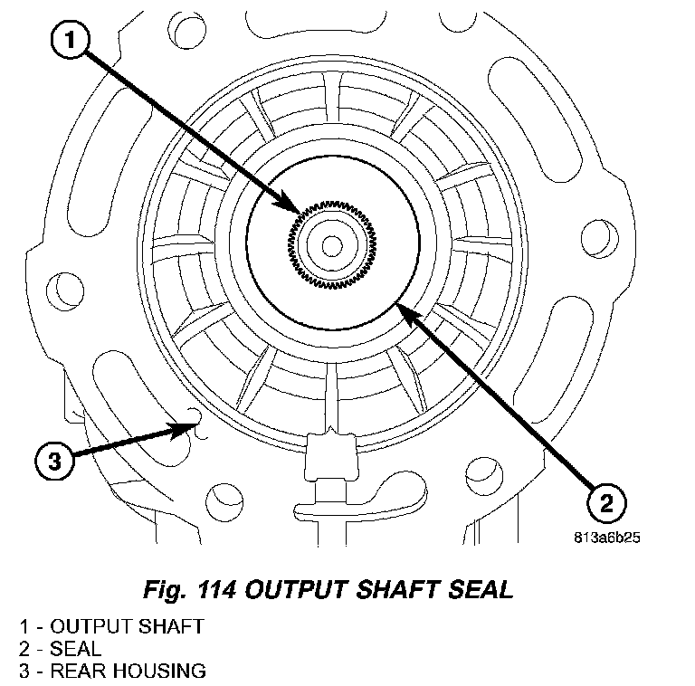 15. Install output shaft (1) (Fig. 114) seal (2) in rear housing with Installer 9638.