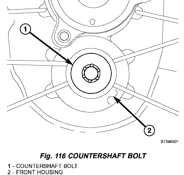 17. Install countershaft bolt (1) (Fig. 116) into the front housing (2) and tighten to 100 Nm (74 ft. lbs.).