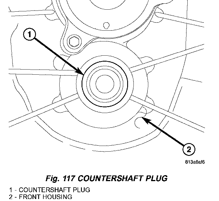 18. Install countershaft plug (1) (Fig. 117) in front housing (2) with Installer 7829-A and Handle C-4171.