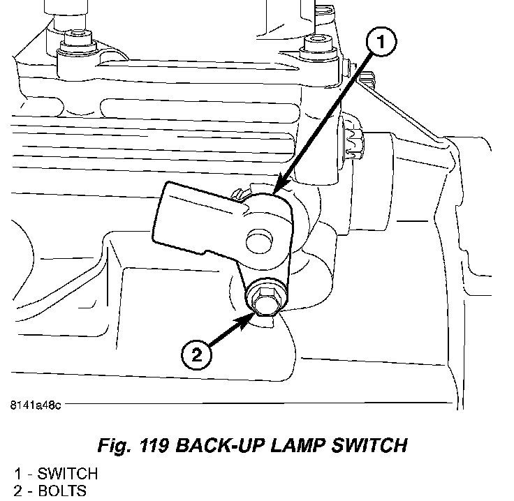 22. Install back up lamp switch (1) and bolt (2) (Fig. 119).