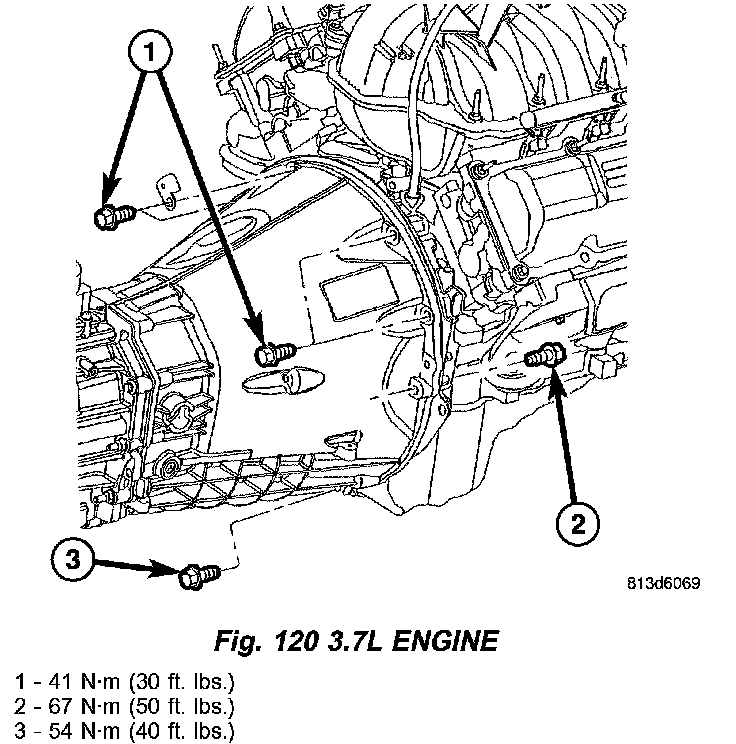 2. On 3.7L engine tighten bolts (1) (Fig. 120) to 41Nm (30 ft. lbs.). Tighten bolts (2) to 67 Nm (50 ft. lbs.). Tighten bolts (3) to 54 Nm (40 ft. lbs.).