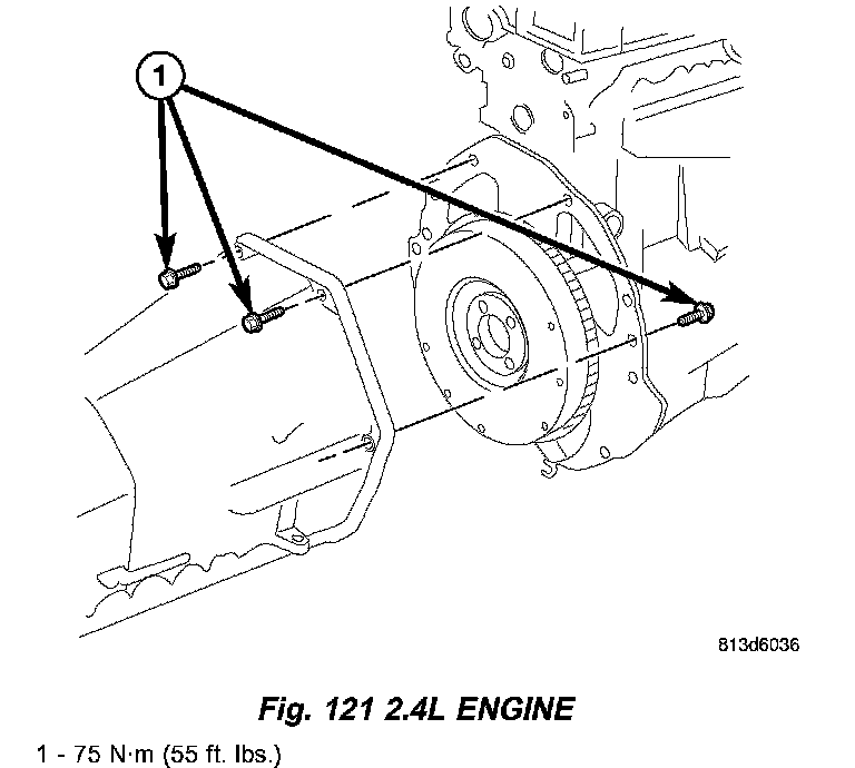 3. On 2.4L engine tighten bolts (1) (Fig. 121) to 75 Nm (55 ft. lbs.). Install lower dust shield and tighten bolts to 34 Nm (25 ft. lbs.)