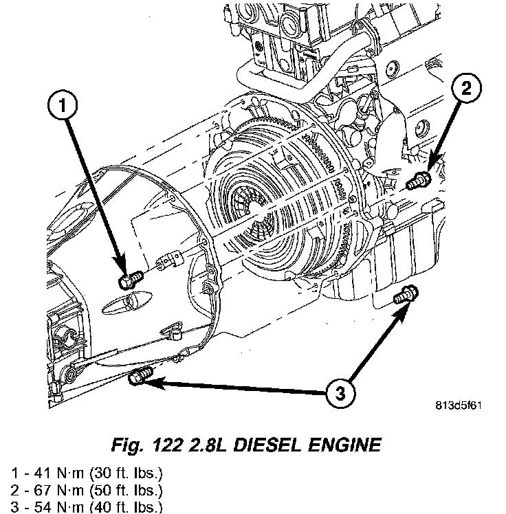 4. On 2.8L diesel engine tighten bolts (1) (Fig. 122) to 41 Nm (30 ft. lbs.). Tighten bolts (2) to 67 Nm (50 ft. lbs.). Tighten bolts (3) to 54 Nm (40 ft. lbs.).