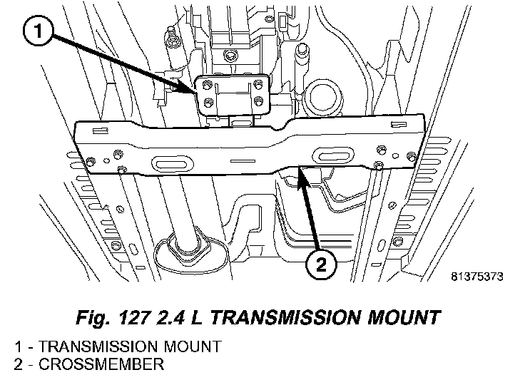 10. Install transmission crossmember (2) (Fig. 127) and tighten bolts to 47 Nm (35 ft. lbs.). Install transmission mount (1) bolts and tighten to 47 Nm (35 ft. lbs.).