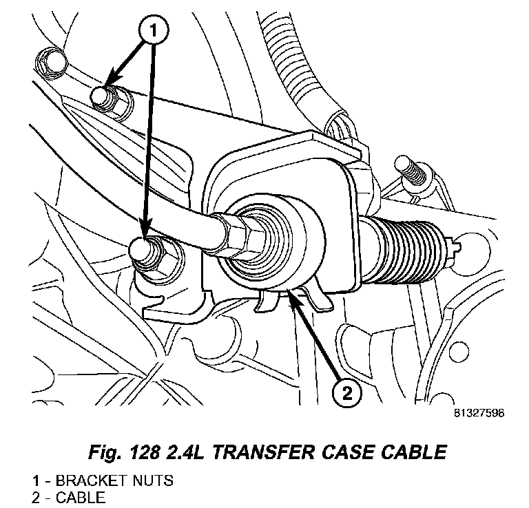 12. Install transfer case shift cable (1) (Fig. 128) on 2.4L. Install transfer case shift linkage on 3.7L.