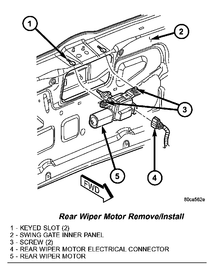 10. Slide the rear wiper motor and mounting bracket forward far enough to disengage the two mounting screws from the keyed slots in the top of the tailgate inner panel.