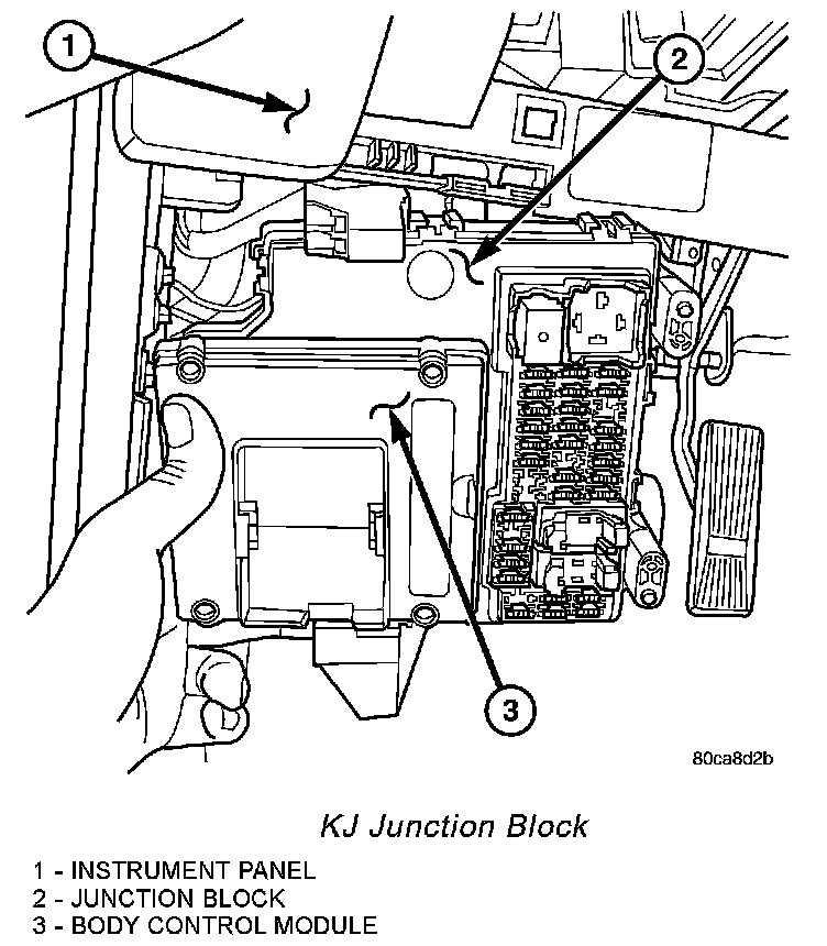 The junction block also provides the mounting location for the Body Control Module (BCM) and Remote Keyless Entry (RKE) Module. Refer to the Electronic Control Modules section for more information on these two modules. The body control module is secured to the junction block assembly with four screws and multiple electrical coelectrical The remote keyless entry module is mounted on the body control module via a single built-in electrical connector. With the junction block in its normal mounting location the body control module and remote keyless entry module are not accessible.