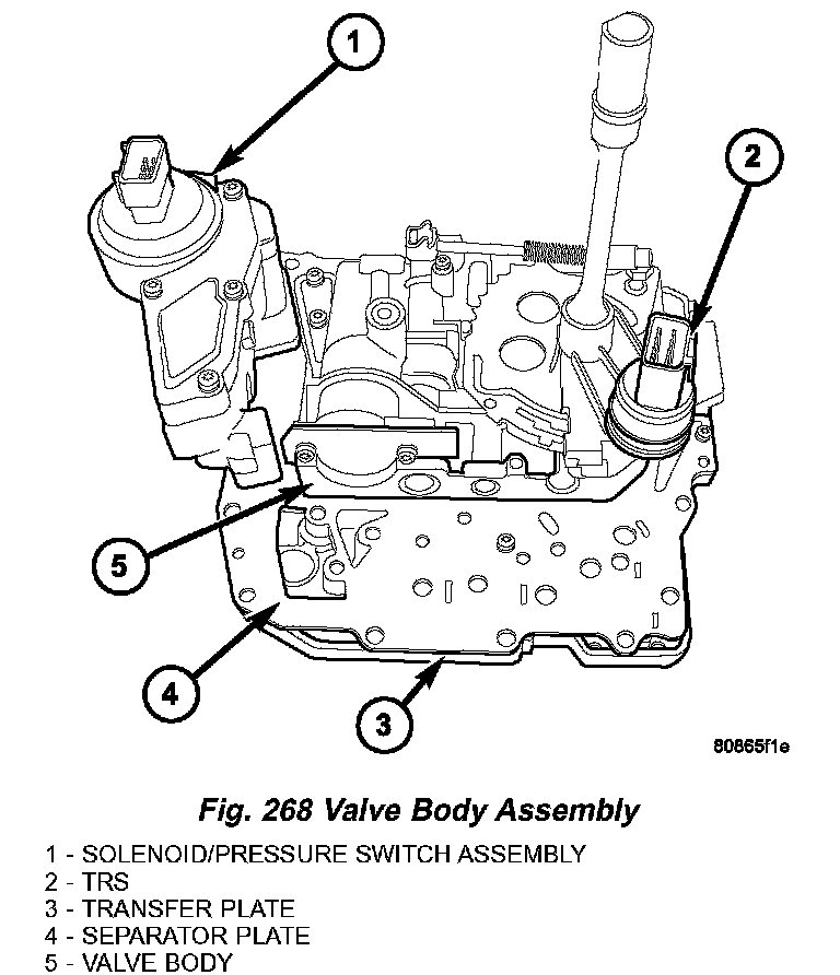 The Transmission Range Sensor (TRS) (2) (Fig. 268) is mounted to the top of the valve body inside the transmission and can only be serviced by removing the valve body assembly. The electrical connector extends through the transmission case.