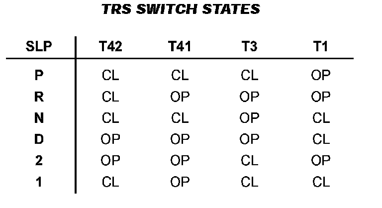The Transmission Range Sensor (TRS) communicates shift lever position (SLP) to the TCM as a combination of open and closed switches. Each shift lever position has an assigned combination of switch states (open/closed) that the TCM receives from four sense circuits. The TCM interprets this information and determines the appropriate transmission gear position and shift schedule.