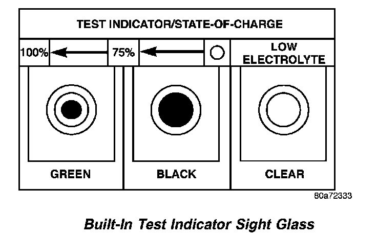 An indicator (hydrometer) built into the top of the battery case provides visual information for battery testing. Like a hydrometer, the built-in indicator measures the specific gravity of the battery electrolyte. The specific gravity of the electrolyte reveals the battery state-of-charge; however, it will not reveal the cranking capacity of the battery. A load test must be performed to determine the battery cranking capacity. Refer to Standard Procedures for the proper battery load test procedures.