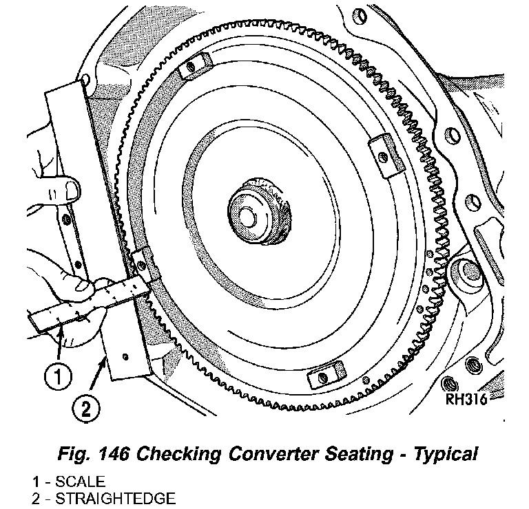 6. Check converter seating with steel scale and straightedge (Fig. 146). Surface of converter lugs should be at least 13 mm (1/2 inch) to rear of straightedge when converter is fully seated.