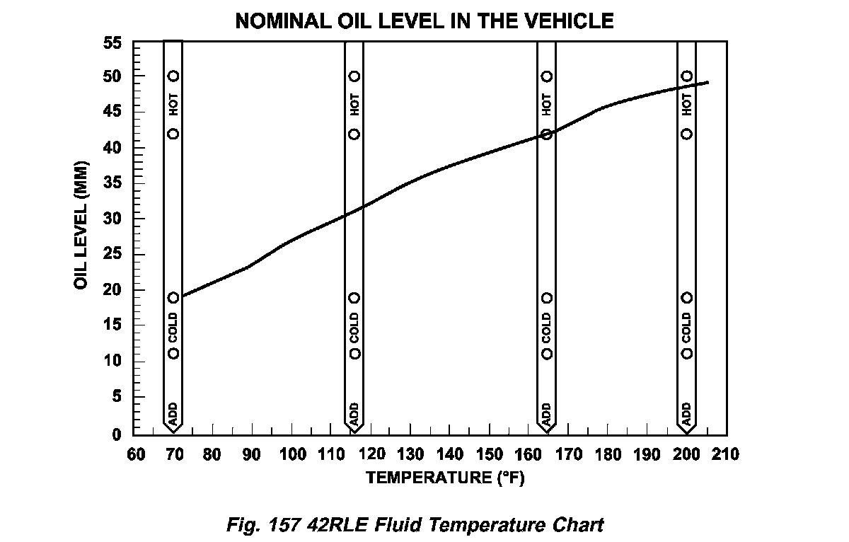 6. Adjust transmission fluid level shown on the dipstick according to the 42RLE Fluid Temperature Chart (Fig. 157). Use only Mopar (R) ATF + 4, Automatic Transmission Fluid.
