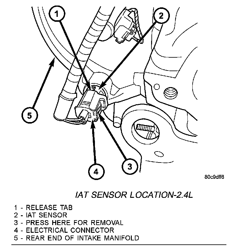The intake manifold air temperature (IAT) sensor is installed into the intake manifold plenum at the rear end of the intake manifold.