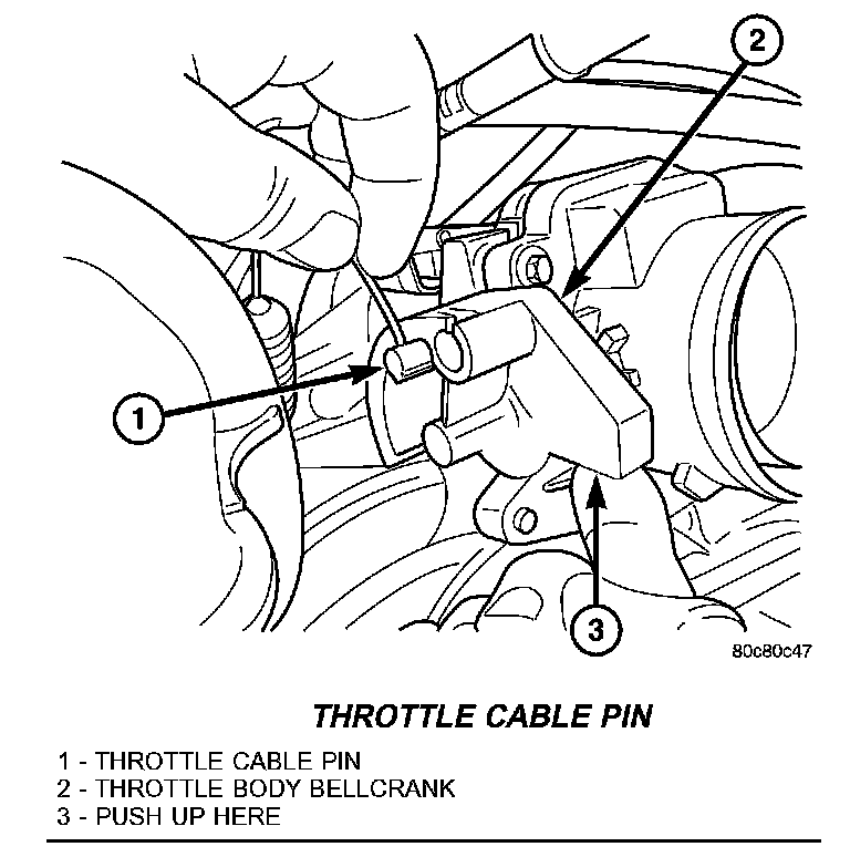 3. Hold throttle in wide open position. While held in this position, slide throttle cable pin from throttle body bellcrank.