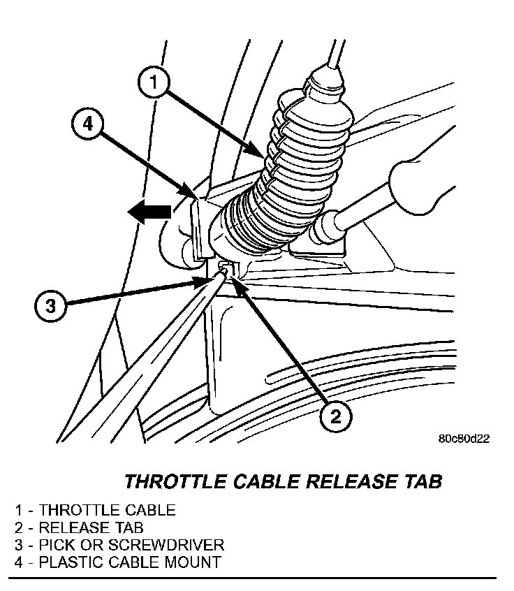 4. Using a pick or small screwdriver, press release tab to release plastic cable mount from bracket. Press on tab only enough to release cable from bracket. If tab is pressed too much, it will be broken. Slide plastic mount towards right side of vehicle to remove throttle cable from throttle body bracket.