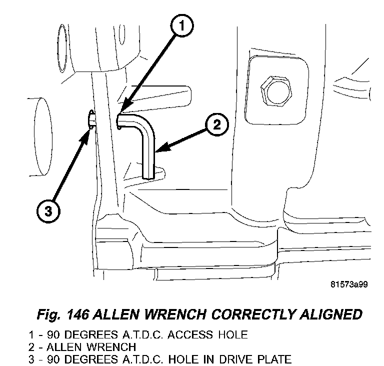 6. Insert the long end of a 6 mm Allen wrench into the 90 degree ATDC access hole on the right lower side of the engine block. The engine is aligned properly when the short end of the Allen wrench is parallel to the rear of the engine block. (Fig. 146).