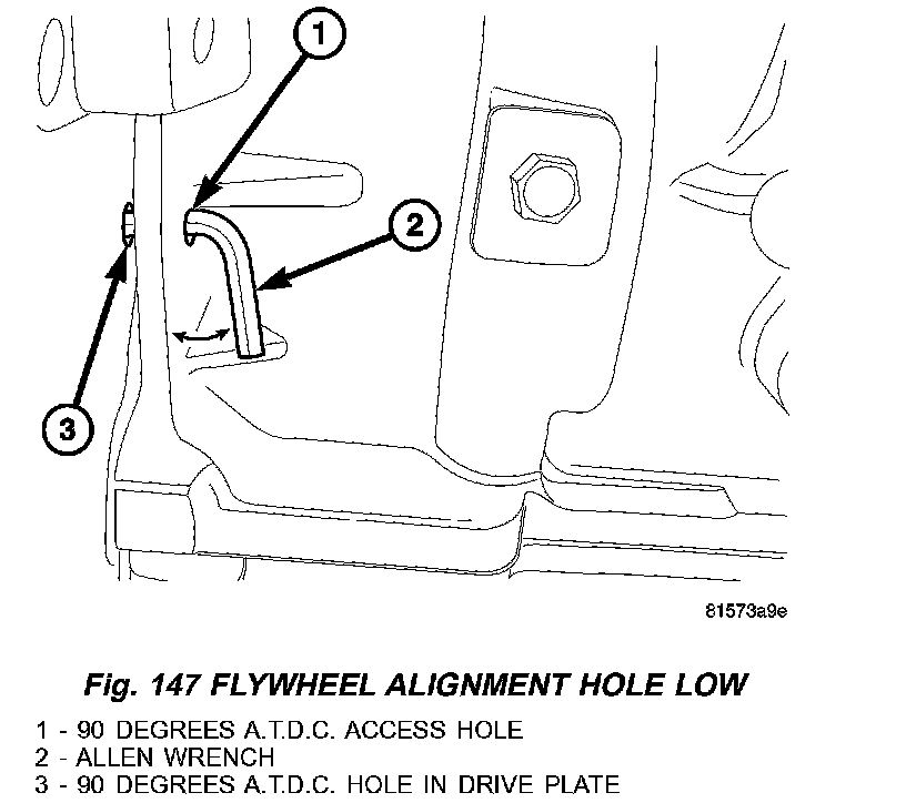 7. If the small end of the Allen wrench protrudes away from the engine block (alignment hole in the flywheel, flex plate too low) rotate the crankshaft hub bolt clockwise in small increments until proper alignment is obtained (Fig. 147).