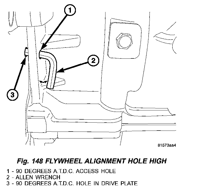 8. If the small end of the Allen wrench is too close to the engine block (alignment hole in the flywheel, flex plate too high), remove the Allen wrench and rotate the crankshaft around again to the three O'clock position, or 90 degree ATDC, and begin the alignment sequence again (Fig. 148).