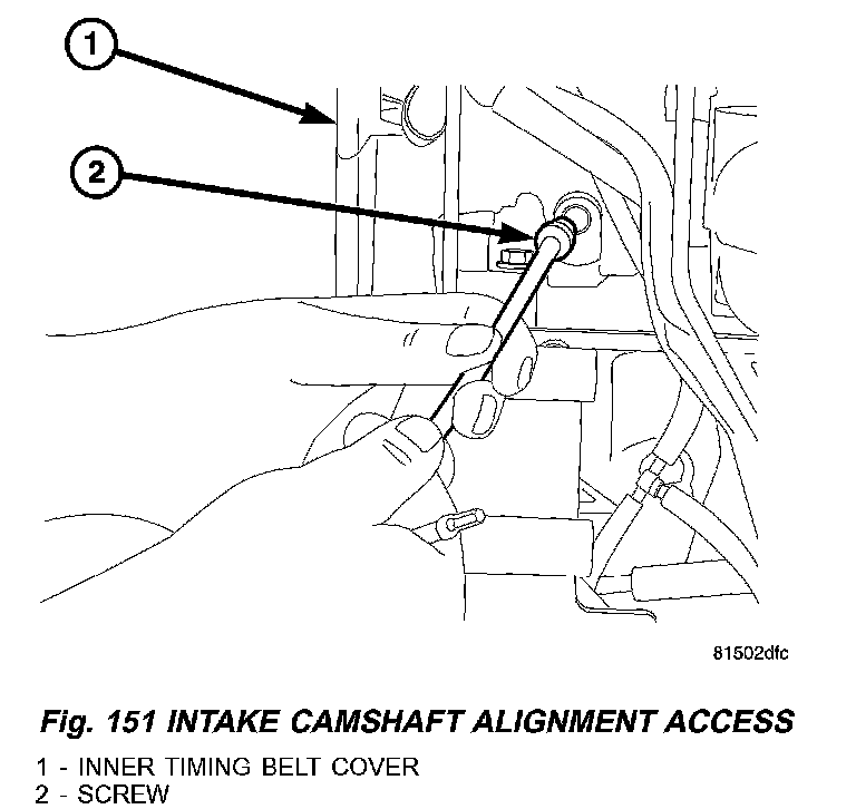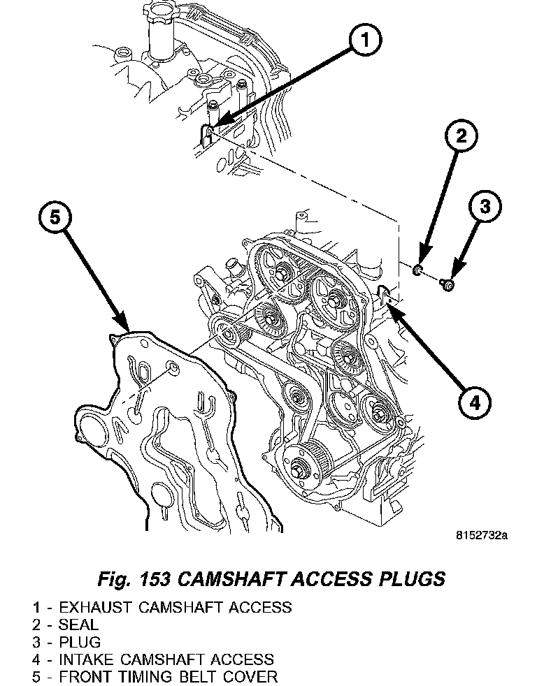 17. Install both camshaft access plugs. Tighten the access plugs to 10.8 Nm (95 inch lbs.) (Fig. 153).