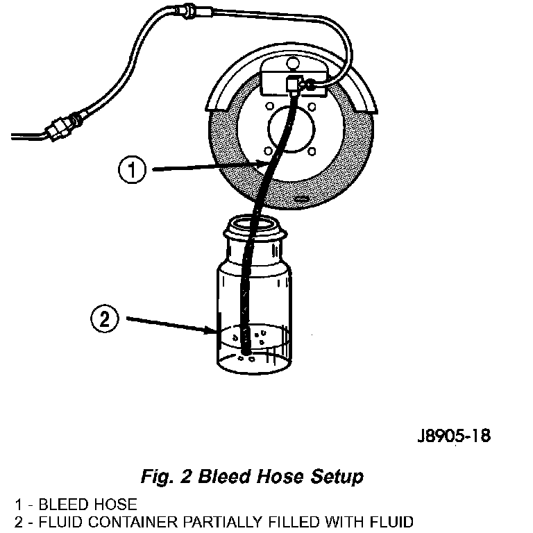 3. Attach one end of bleed hose to bleed screw and insert opposite end in glass container partially filled with brake fluid (Fig. 2). Be sure end of bleed hose is immersed in fluid.
