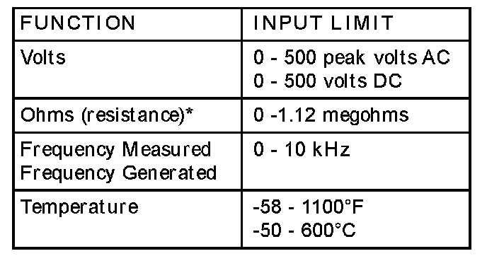 - Voltage between any terminal and ground must not exceed 500 v DC or 500 v peak AC.