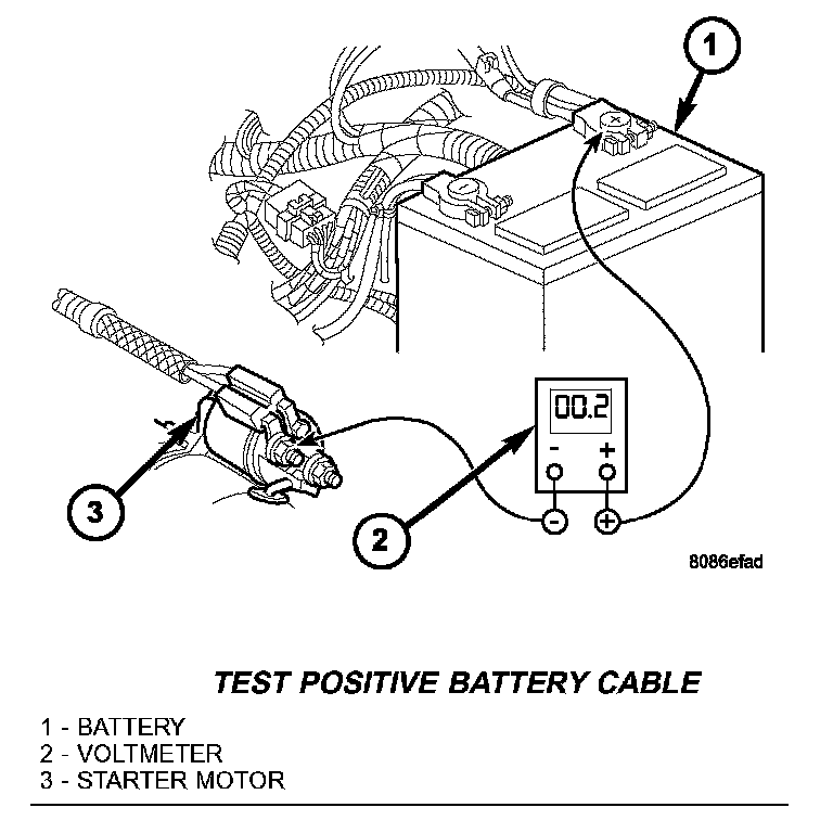Example: When testing resistance of positive battery cable, touch voltmeter leads to positive battery cable clamp and cable connector at starter solenoid. If you probe positive battery terminal post and cable connector at starter solenoid, you are reading combined voltage drop in positive battery cable clamp-to-terminal post connection and positive battery cable.