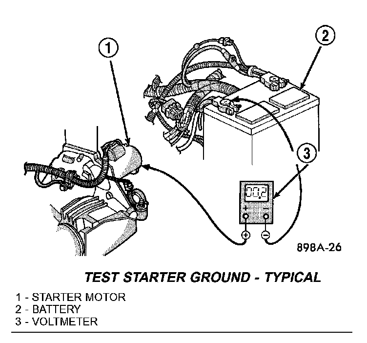 1. Connect positive lead of voltmeter to negative battery cable terminal post Connect negative lead of voltmeter to negative battery cable clamp.Rotate and hold ignition switch in Start position. Observe voltmeter. If voltage is detected, correct poor contact between cable clamp and terminal post.