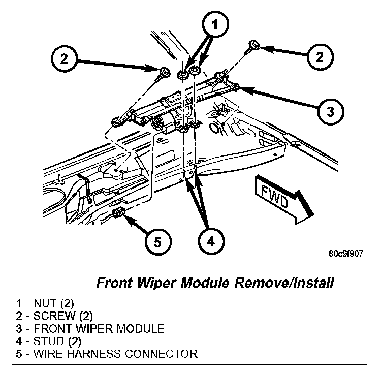 4. Install and tighten the two nuts that secure the front wiper module to the two weld studs on the bottom of the cowl plenum panel. Tighten the nuts to 8 N.m (72 in.lbs.).