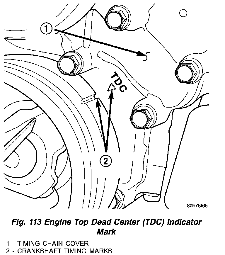 2. Using a mirror, locate the TDC arrow on the front cover. Rotate the crankshaft until the mark on the crankshaft damper (2) is aligned with the TDC arrow on the front cover (Fig. 113) (2). The engine is now at TDC.