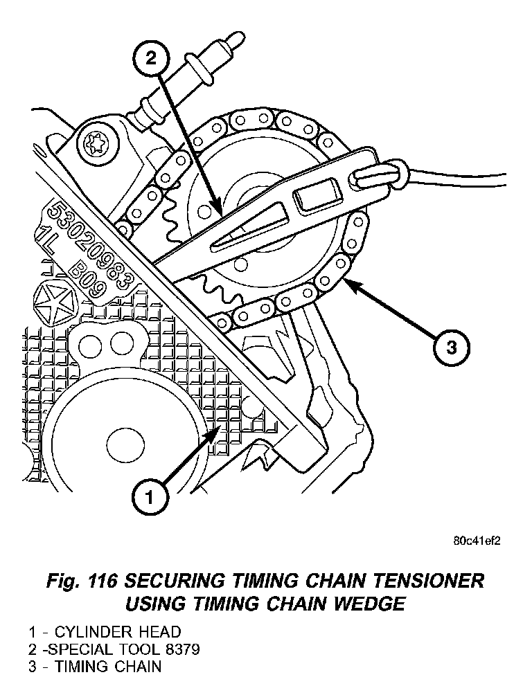 1. Using Chain Tensioner Wedge (Fig. 116), Special Tool 8379 (2), stabilize the secondary chain drive. For reference purposes, mark the chain-to-sprocket position.