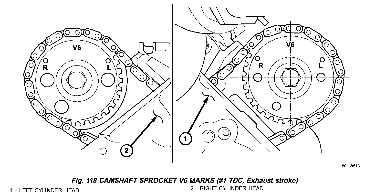 4. Re-index the camshaft drive gear in the chain until the V6 mark is at the same position as the V6 mark on the opposite camshaft drive gear (Fig. 118) (1,2).