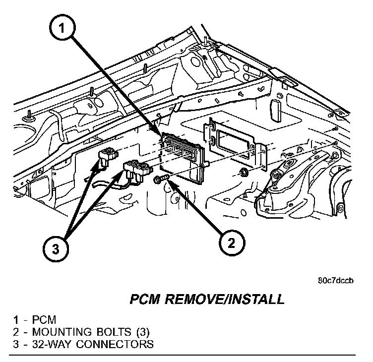 USE THE DRB SCAN TOOL TO REPROGRAM THE NEW POWERTRAIN CONTROL MODULE (PCM) WITH THE VEHICLES ORIGINAL IDENTIFICATION NUMBER (VIN) AND THE VEHICLES ORIGINAL MILEAGE. IF THIS STEP IS NOT DONE, A DIAGNOSTIC TROUBLE CODE (DTC) MAY BE SET.REMOVAL