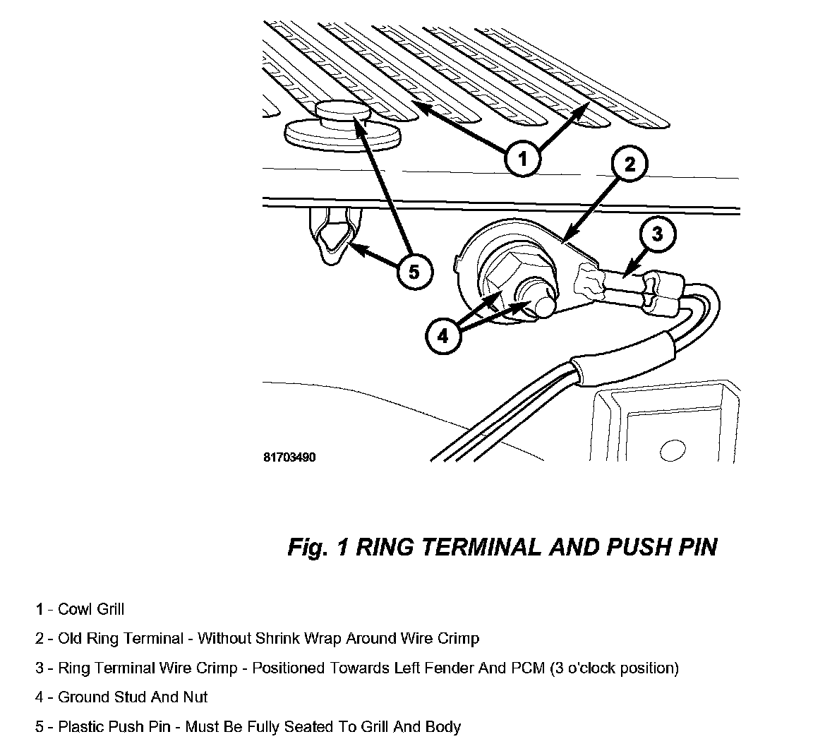 2. Remove and discard the old ground nut used to attach the ground wire ring terminal to the vehicle body (Fig. 1).