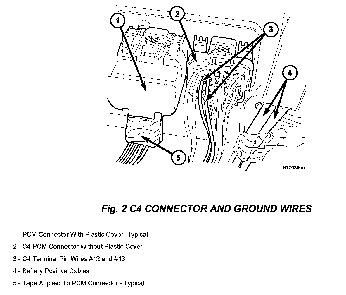 5. Locate the two ground wires and terminals (pins # 12 and # 13) in the C4 connector (Fig. 2).